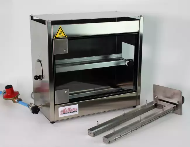 Flame resistance test instrument according to automotive standards. View of the instrument and the Tester Holder.