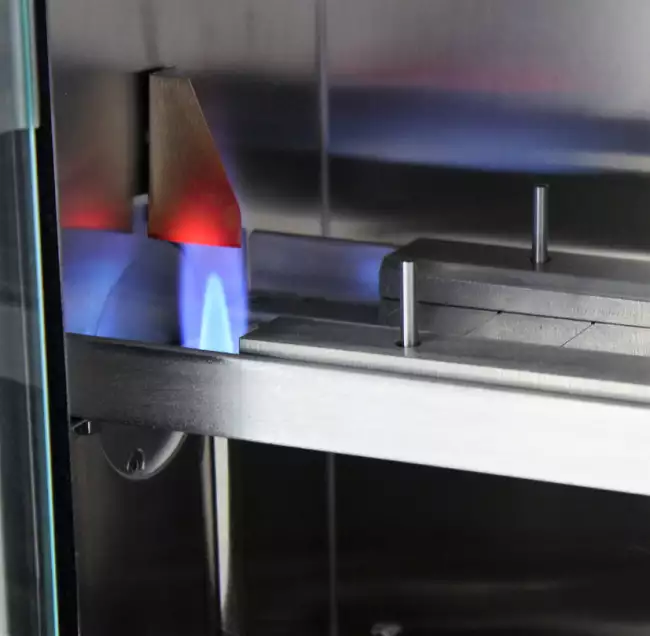 Flame resistance test instrument for determining the horizontal flammability rating of materials used in interior compartments of motor vehicles. Interior detail with ignited flame.
