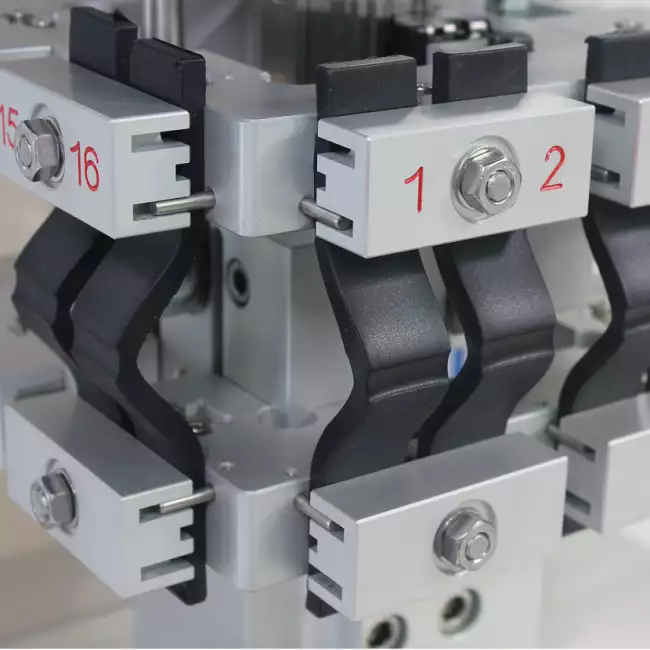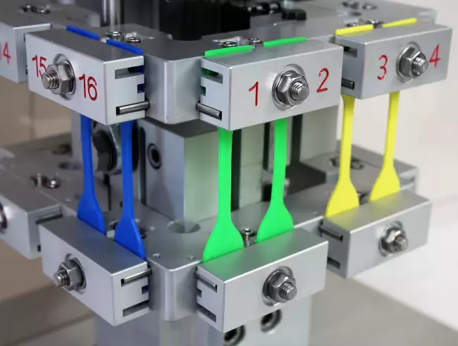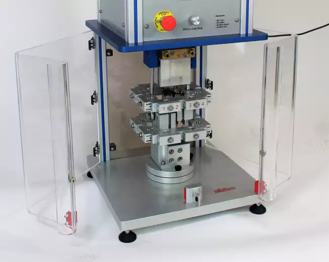De Mattia flexometer in standard version. Detail of the tensile fatigue test.