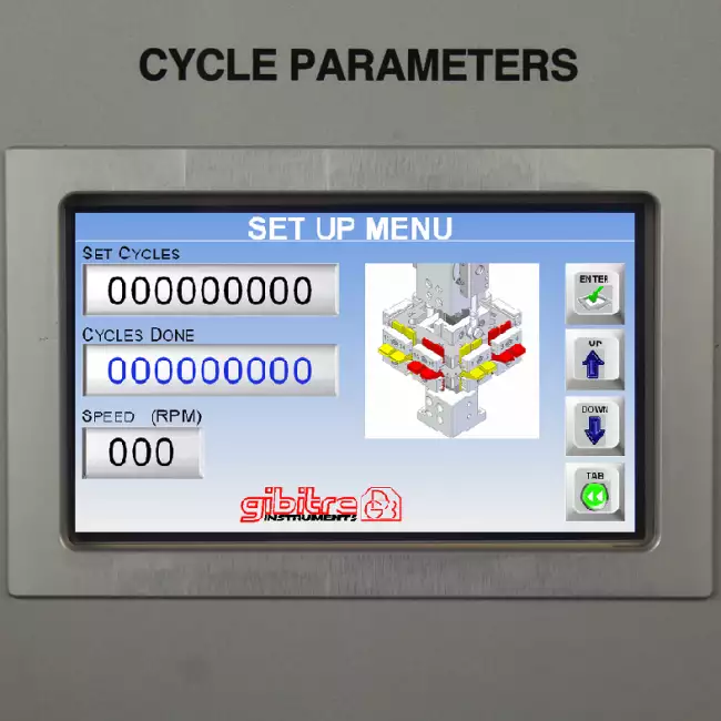 Speed adjustment  from 60 to 300 Cycles/min - 1 to 5 Hz  Run Adjustment  Between 0 and 60 mm  Distance of the clamps  Max 100 mm  Sample Holder  16 samples can be tested at the same time  Set of the number of cycles before automatic stop  Between 1 and 10^9  Maximum force in traction  600 N (at 1 Hz oscillation speed)  Adjusting the position at the end of the test  The instrument automatically moves to the maximum opening position at the end of the set number of cycles.  Data displayed  Set number of cycles, Cycles performed, oscillation Frequency