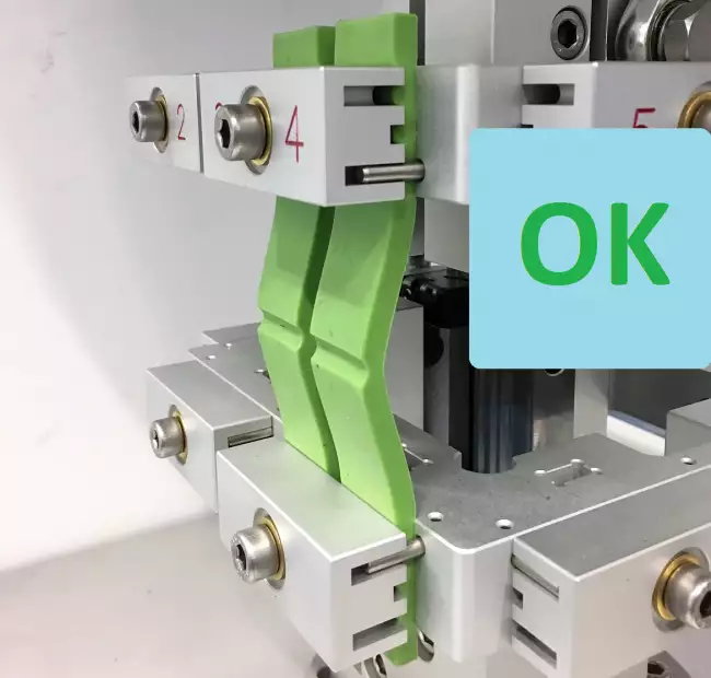 fatigue de mattia basic: De Mattia Flexometer. The Gibitre instrument automatically stops with the specimen in the extended position so as not to affect the results by keeping the specimen bent. fatigue de mattia basic: De Mattia Flexometer. The Gibitre instrument automatically stops with the specimen in the extended position so as not to affect the results by keeping the specimen bent. fatigue de mattia basic: De Mattia flexometer by Gibitre. Instrument stops in extended position. Image shows specimens stopped in incorrect position.