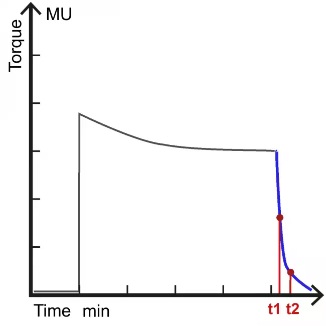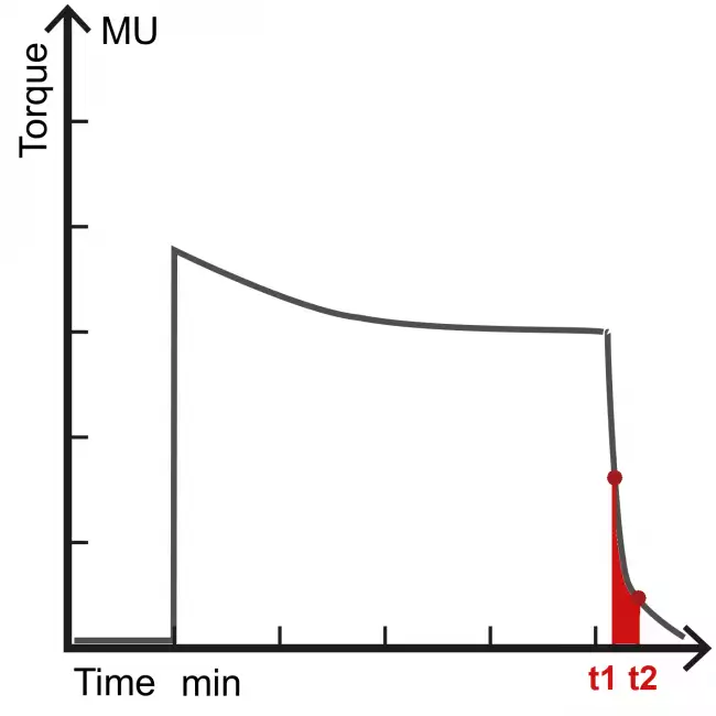 Stress Relaxation test consists of determining the decay of the Mooney torque immediately after the determination of the Mooney viscosity. After abruptly stopping the rotor at the end of the Mooney viscosity measurement, the decrease in torque is recorded as a function of time. The rate of change of the torque is evaluated over a short time interval.