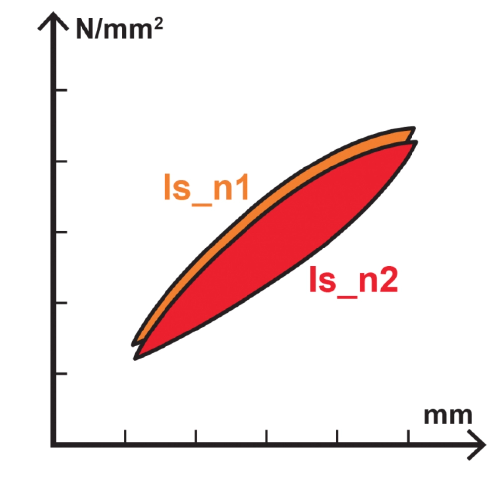 Dt_Is: Hysteresis varation between cycles x and y This calculation returns the Delta Hysteresis ie the difference of energy lost during cycle x and cycle y. The result corresponds to the difference of the areas of the loops corresponding to the load-unload cycles selected. This calculation permits to evaluate how the characteristics of the sample modify by applying a repetitive cyclic force.