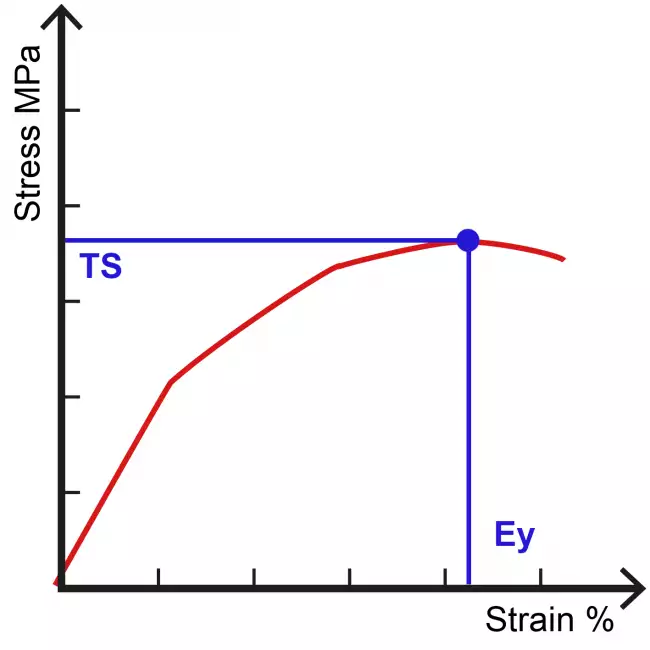 Ey: Elongation at Yeld - Strain at Yeld This calculation returns the Strain of the sample corresponding to Maximum Tensile Strength.
