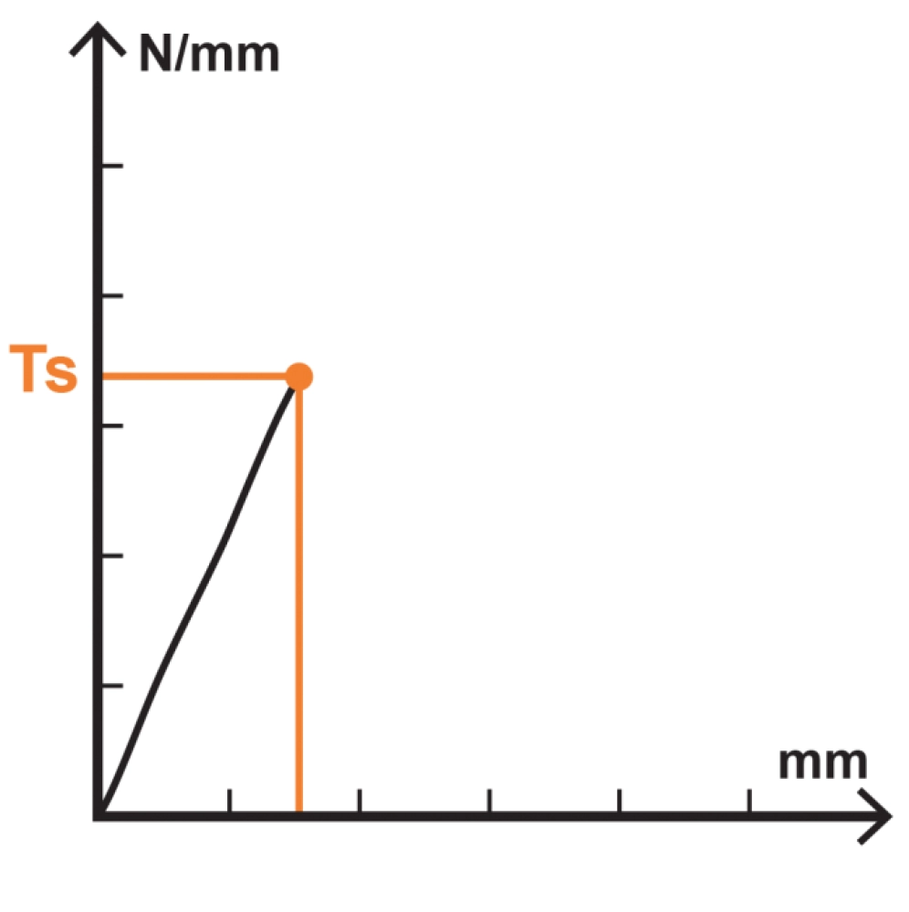 Ts: Tear Strength This calculation returns the Tear Strengh of the sample according to ISO 34-1 or similar standards. The Tear Strenght is measured a the Maximum Force (N) needed to tear the sample divided for the Thickness of the sample (mm).
