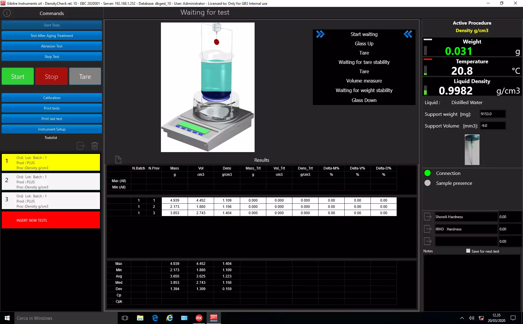 : Density-Check densimeter. Software for using the instrument. The software waits for the sample to be measured to be inserted into the instrument before starting the automatic measurement cycle. : Density-Check densimeter. Software for using the instrument. The software waits for the sample to be measured to be inserted into the instrument before starting the automatic measurement cycle. : Gibitre software. Sequence of tests to be performed with customized visualization. : Gibitre software. Control software for Density-Check instrument. Temperature measurement detail with automatic correction of reference liquid density.