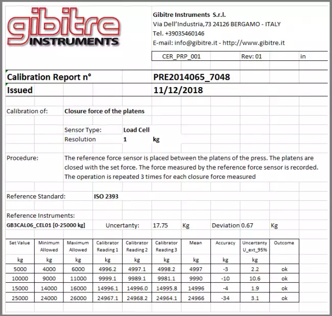 The Calibration certificate supplied with the machine includes the calibration of the force at several force application streps.