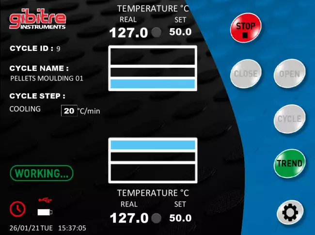 lab press cooling option: Laboratory press. Example of molding cycle with sequence of automatic opening, closing, and temperature control operations. lab press cooling option: Laboratory press. Example of molding cycle with sequence of automatic opening, closing, and temperature control operations. lab press cooling option: Laboratory press. PLC control. Main display page with example of speed-controlled cooling.