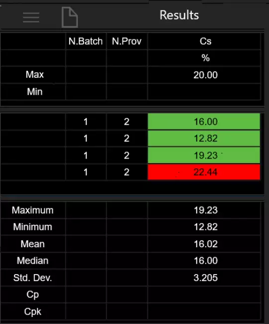 The comparison between the results and the tolerance limits is carried out automatically at the end of each test: the test results are colored (Green, Yellow or Red) based on the outcome of the comparison with the limits.